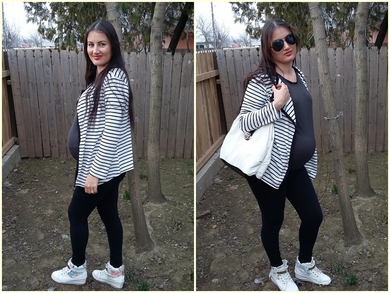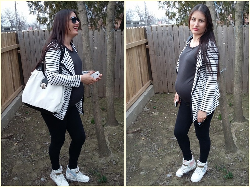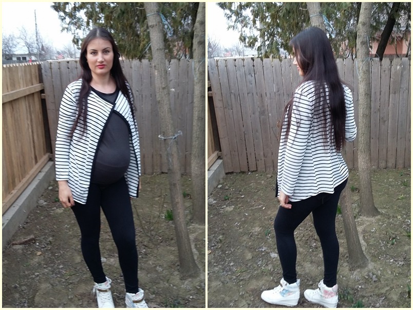 Cardiganul in dungi este din bumbac si este subtirel. Culorile cardiganului sunt negru si alb ( desi eu aveam impresia ca ar fi crem din pozele lor de pe site, ca mi-a sarit randul unde scria clar alb si negru la culoare). Sunt 3 marimi disponibile, eu am luat L si imi vine perfect, mai putin acum la burtica, dar cand burtica nu va mai fi va arata exact ca in pozele lor.
