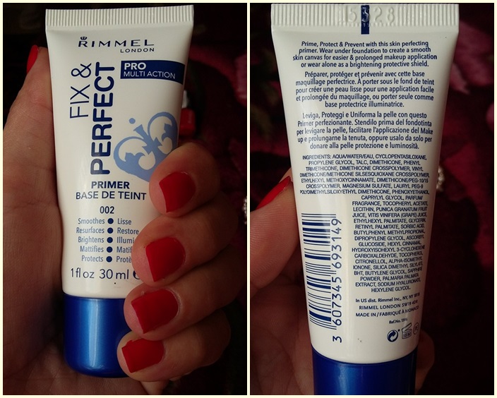 Incep cu Rimmel Fix & Perfect baza pentru machiaj 5 in 1 care pur si simplu m-a uimit intr-un mod foarte placut. De obicei, nu am mari asteptari de la o baza pentru machiaj, dar de data aceasta am primit mai mult decat am sperat. Este o baza pentru machiaj foarte buna: matifiaza, inchide porii, lasa tenul catifelat si luminos, are un miros placut si cel mai important este ca prelungeste rezistenta fondului de ten pentru mult timp. Il recomand si isi merita din plin banii, nu degeaba este 5 in 1.